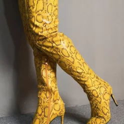 Over The Knee Boots Womens Yellow Snake Print Pointed Toe Stiletto Heel Thigh High Boots
