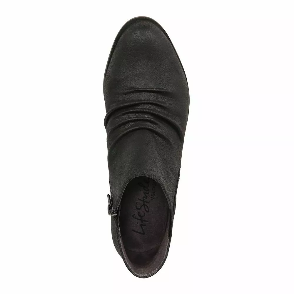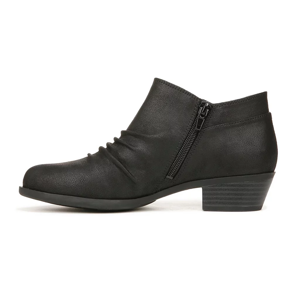 - Microsuede upper with an inside zip, stretch gore panels, and ruched detailing