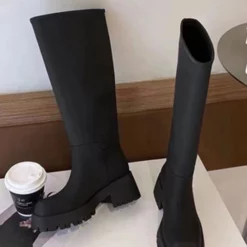 Women’s Black Boots Platform PU Leather Chunky Heel Knee High Boots