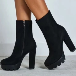 Women Ankle Boots Black Micro Suede Round Toe Chunky Heel High Heel Booties