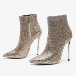 Women Ankle Boots Light Gold Sequined Pointed Toe Stiletto Heel High Heel Booties